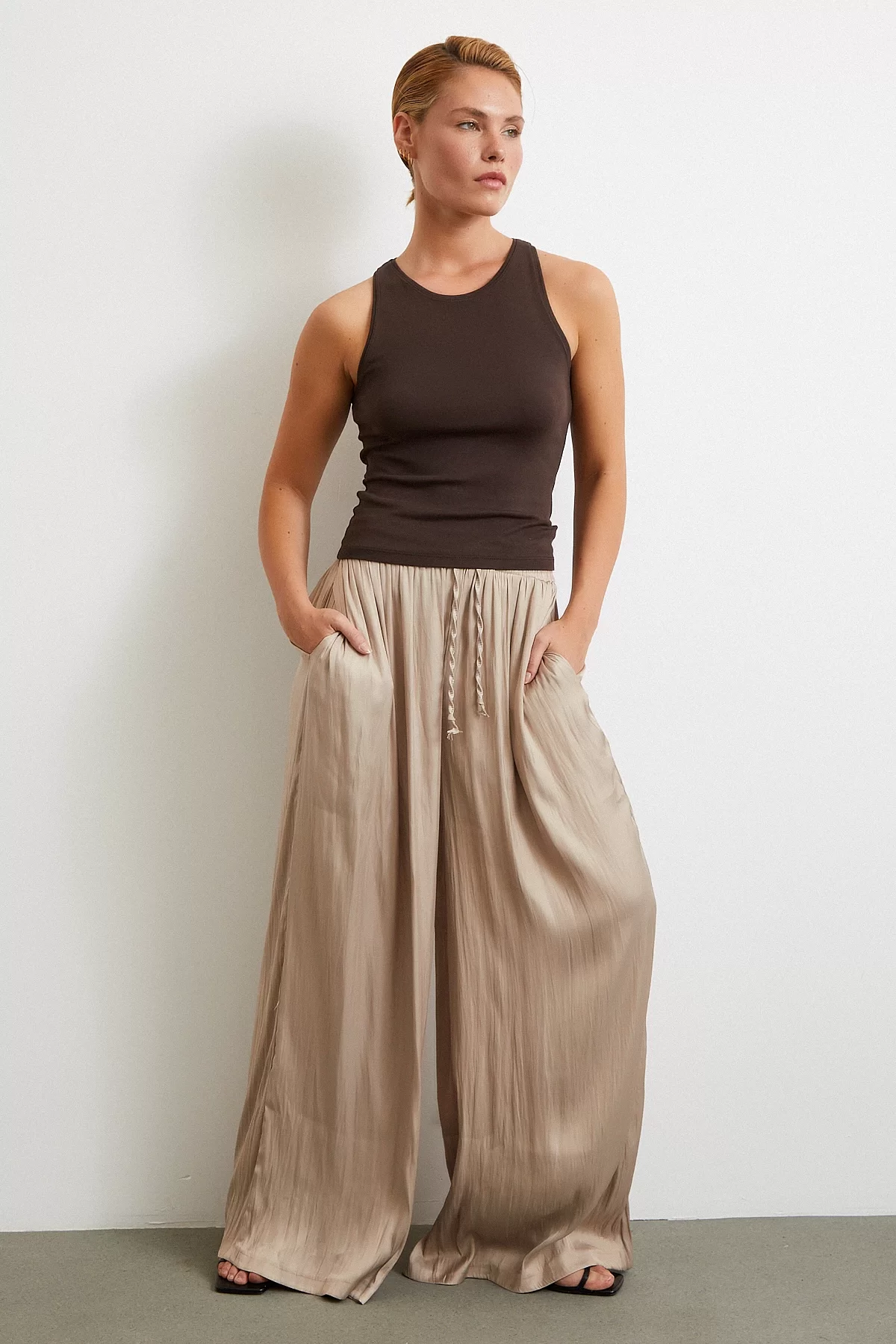 Beli Lastikli Geniş Paça Büzgülü Pantolon Bej