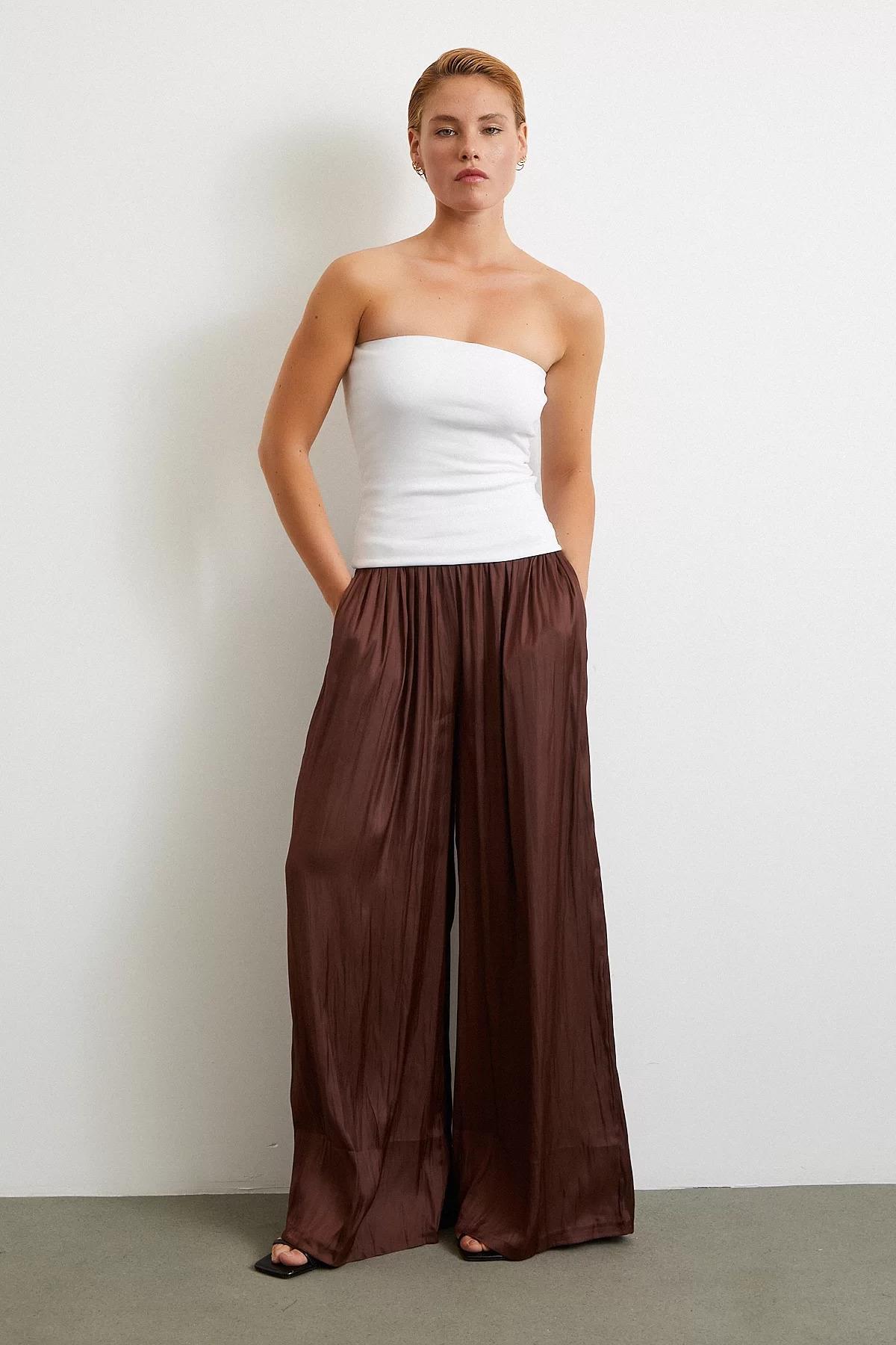 Beli Lastikli Geniş Paça Büzgülü Pantolon Kahve