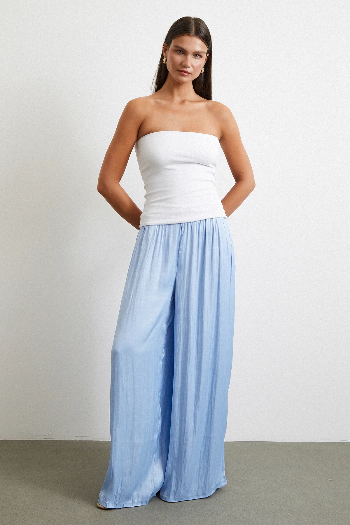 Beli Lastikli Geniş Paça Büzgülü Pantolon Mavi